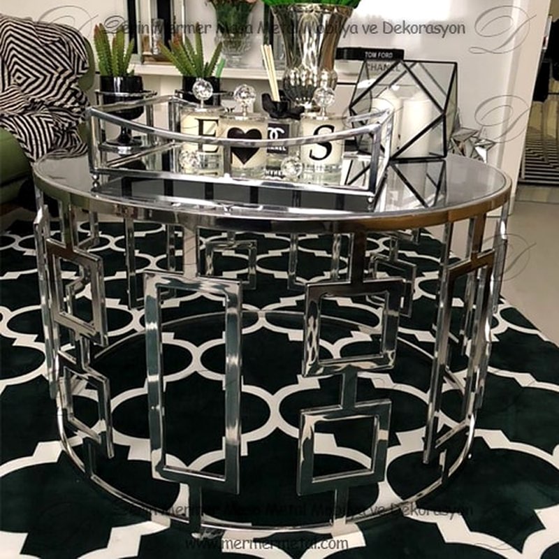 Doğal mermer tablalı orta sehpa modeli. Özel tasarım metal ayaklarla oturma odanızın merkezine şıklık katan, her parçası benzersiz damar desenine sahip sehpa.